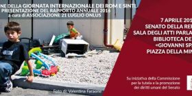 Il 7 aprile 2017, alle ore 11, presso la Sala degli Atti Parlamentari, nella Biblioteca del Senato «Giovanni Spadolini», in Piazza della Minerva, 38, a Roma, l'Associazione 21 luglio, in occasione della Giornata Internazionale dei Rom e Sinti che si celebra l’8 aprile di ogni anno, presenta il suo RAPPORTO ANNUALE 2016. Introduce i lavori: Luigi Manconi, Presidente Com [...]
