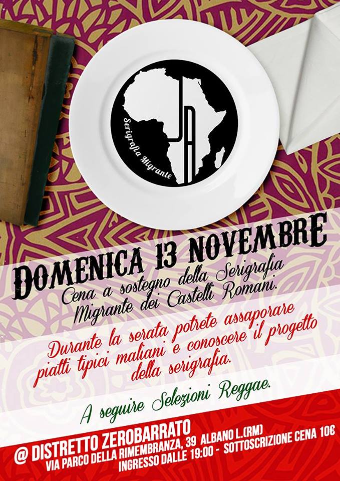 Domenica 13 Novembre, presso Distretto Zero Barrato di Albano Laziale, OPS e Jà Serigrafia Migrante vi invitano ad una cena africana di autofinanziamento per consentire l’acquisto del materiale necessario per portare avanti il progetto con un gruppo di ragazzi richiedenti asilo politico che vivono ad Ariccia. Si tratta di un progetto di stampa serigrafica che attraverso l’arte e l’artigianato consente di far costruire a questi ragazzi una professionalità ed un futuro lavorativo in Italia, per uscire dal sistema di accoglienza che li isola dal resto della cittadinanza. Il progetto della serigrafia sta andando avanti anche grazie alla collaborazione con la Sartoria Migrante Karalò, con la quale i ragazzi stanno realizzando borse e altri materiali che faranno parte dei cesti natalizi solidali della rete nazionale FuoriMercato.