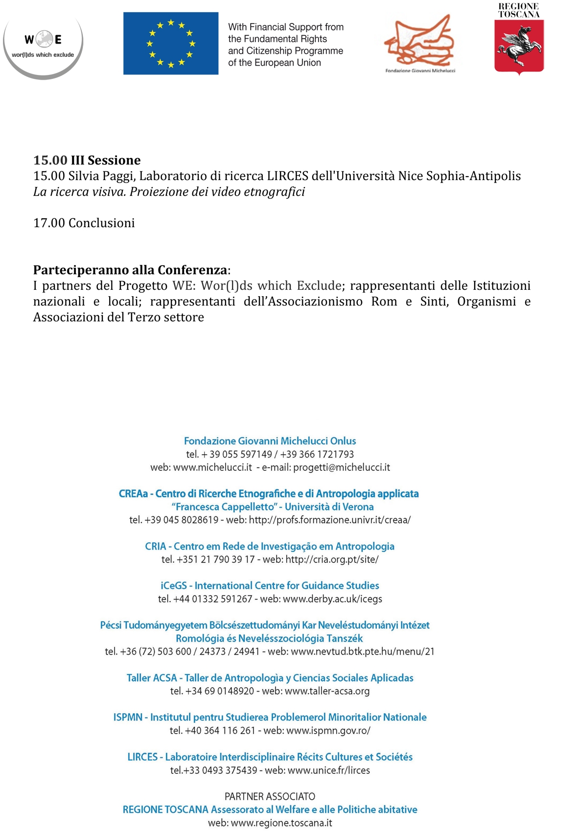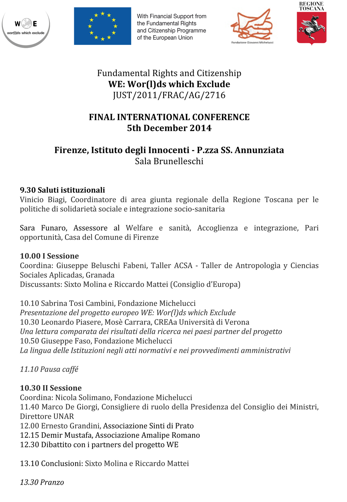 Si terrà a Firenze la conferenza conclusiva del progetto europeo “WE: Wor(l)ds which esclude”, che ha analizzato le questioni legate alla condizione abitativa di Rom e Sinti in sei diversi paesi europei. Durante l’evento finale, “Rom e Sinti nella lingua degli atti normativi e dei provvedimenti amministrativi”, verranno discusse le raccomandazioni per condividere un linguaggio più corretto e attento nella formulazione di norme giuridiche e provvedimenti amministrativi che riguardano i cittadini Rom e Sinti.