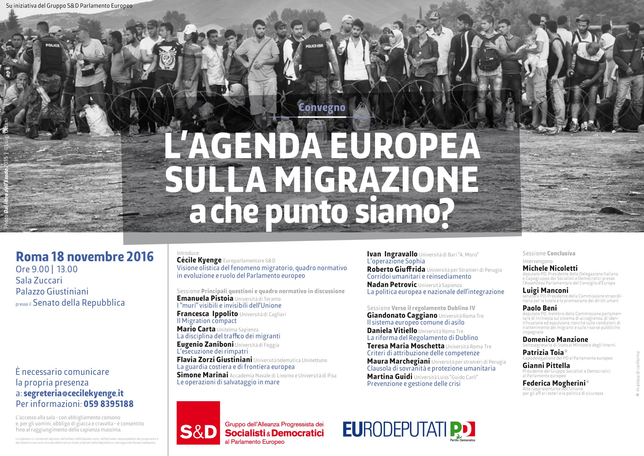 Venerdì 18 novembre, dalle ore 9.00 in poi, presso il Senato della Repubblica, Sala Zuccari – Palazzo Giustiniani, Via della Dogana Vecchia 29, a Roma, si terrà il convegno: “L’agenda europea sulla migrazione: a che punto siamo?”, organizzato dall’europarlamentare Cecile Kyenge. Un appuntamento di alto livello come opportunità per approfondire e fare il punto su uno dei principali temi dell’agenda europea e globale: il fenomeno migratorio e la crisi dei rifugiati, in relazione al ruolo e all’azione dell’Unione Europea.